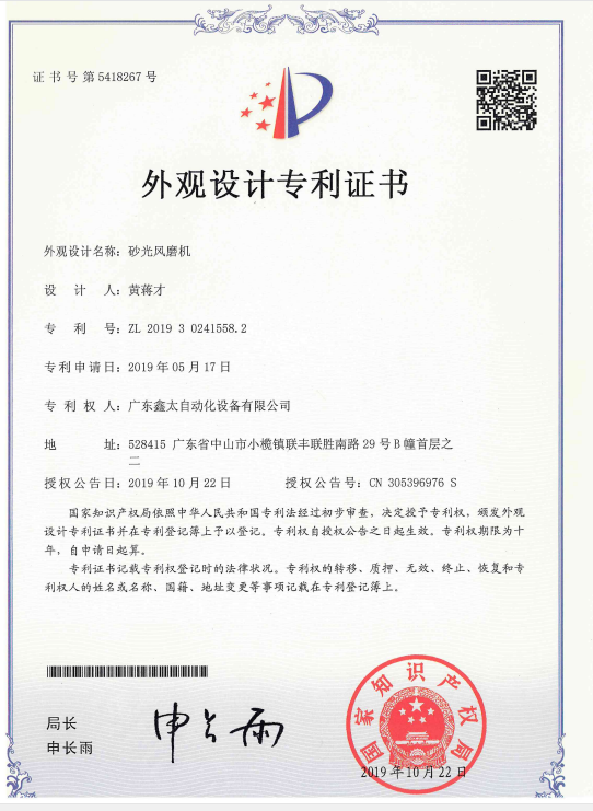 砂光風(fēng)磨機(jī)外觀設(shè)計(jì)專利證書